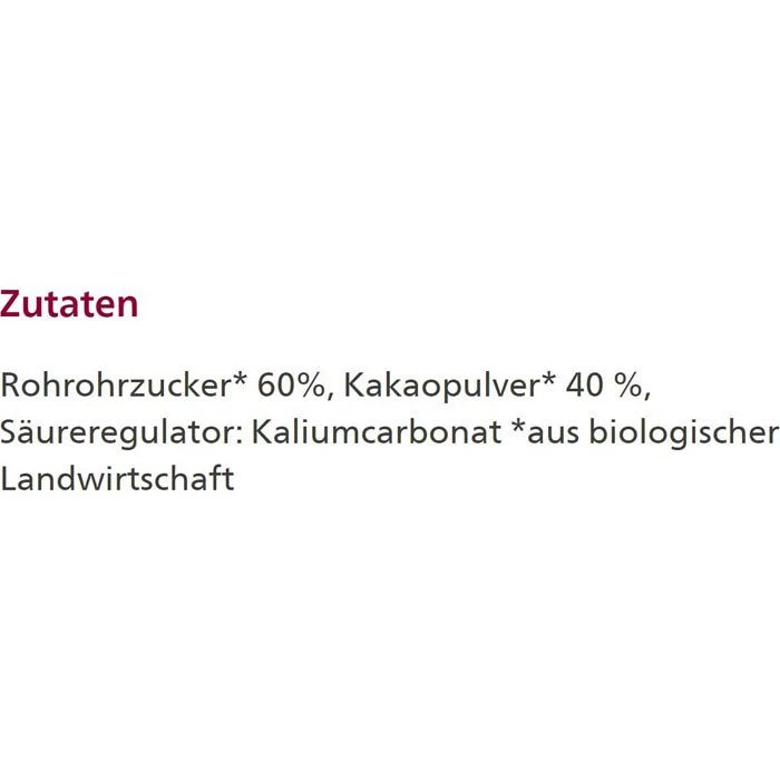 Rohrohrzucker 60%, Kakaopulver 40%, Säureregulator: Kaliumcarbonat