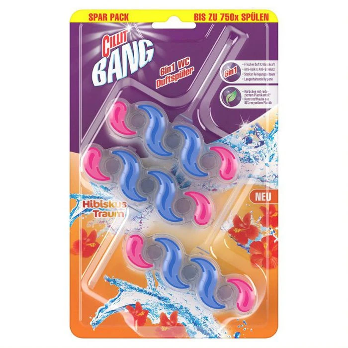 sonstiges: reinigt die Toilette mit 6 Action Formel schnell und hygienisch, Anti-Kalk, Glanz-Kraft, Anti-Schmutz, Aktiv-Reinigungsschaum, faszinierendes blaues Farbwasser, Langzeit-Frische und Hygiene, spendet frischen lang anhaltenden Duft, ermöglicht bis zu 750 Spülgänge