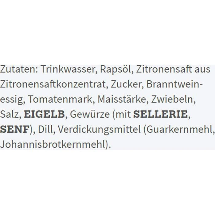 Zutaten: Trinkwasser, Rapsöl, Zitronensaft aus Zitronensaftkonzentrat, Zucker, Branntweinessig, Tomatenmark, Maisstärke, Zwiebeln, Salz, EIGELB, Gewürze (mit SELLERIE, SENF), Dill, Verdickungsmittel (Guarkernmehl, Johannisbrotkernmehl).