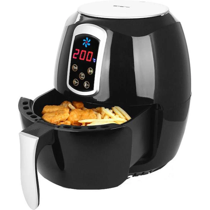 sonstiges: digitales Display, mit Temperaturregler, Frittieren ohne Öl dank schneller Luftzirkulation, zum Frittieren, Backen, Rösten und Grillen geeignet, einstellbare Temperatur und Zeit für ein perfektes Ergebnis, ausreichend für ca. 500g Pommes, der Frittierkorb und das Schubfach sind spülmaschinenfest, hitzebeständiges Gehäuse, Anti-Rutsch-Füße