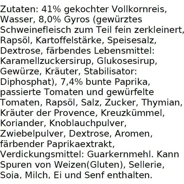 Zutaten: 41% gekochter Vollkornreis, Wasser, 8,0% Gyros (gewürztes Schweinefleisch zum Teil fein zerkleinert, Rapsöl, Kartoffelstärke, Speisesalz, Dextrose, färbendes Lebensmittel: Karamellzuckersirup, Glukosesirup, Gewürze, Kräuter, Stabilisator: Diphosphat), 7,4% bunte Paprika, passierte Tomaten und gewürfelte Tomaten, Rapsöl, Salz, Zucker, Thymian, Kräuter der Provence, Kreuzkümmel, Koriander, Knoblauchpulver, Zwiebelpulver, Dextrose, Aromen, färbender Paprikaextrakt, Verdickungsmittel: Guarkernmehl. Kann Spuren von WEIZEN (GLUTEN), SELLERIE, SOJA, MILCH, EI und SENF enthalten.