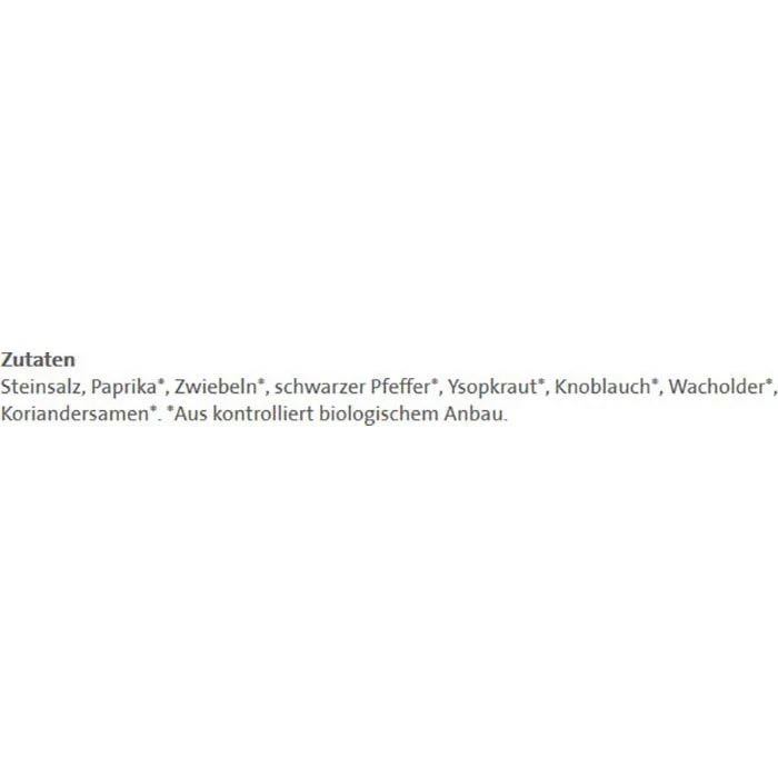 Zutaten: Steinsalz, Paprika*, Zwiebeln*, schwarzer Pfeffer*, Ysopkraut*, Knoblauch*, Wacholder*, Koriandersamen*. *Aus kontrolliert biologischem Anbau.