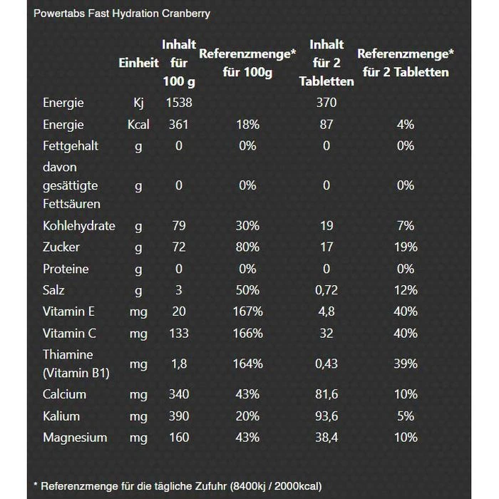 Zutaten: Dextrose, Säuerungsmittel: Zitronensäure; Natriumhydrogencarbonat, Stärke, Maltodextrin, natürliche Aromen, Kaliumcarbonat, Magnesiumcarbonat, Calciumcarbonat, Natriumchlorid, Calciumsalze der Orthophosphorsäure, Sü?ungsmittel: Aspartam; konzentrierte Rote Beete Saft in Pulverform, Vitamin C, Vitamin E, Thiamin (B1). Enthält eine Phenylalaninquelle