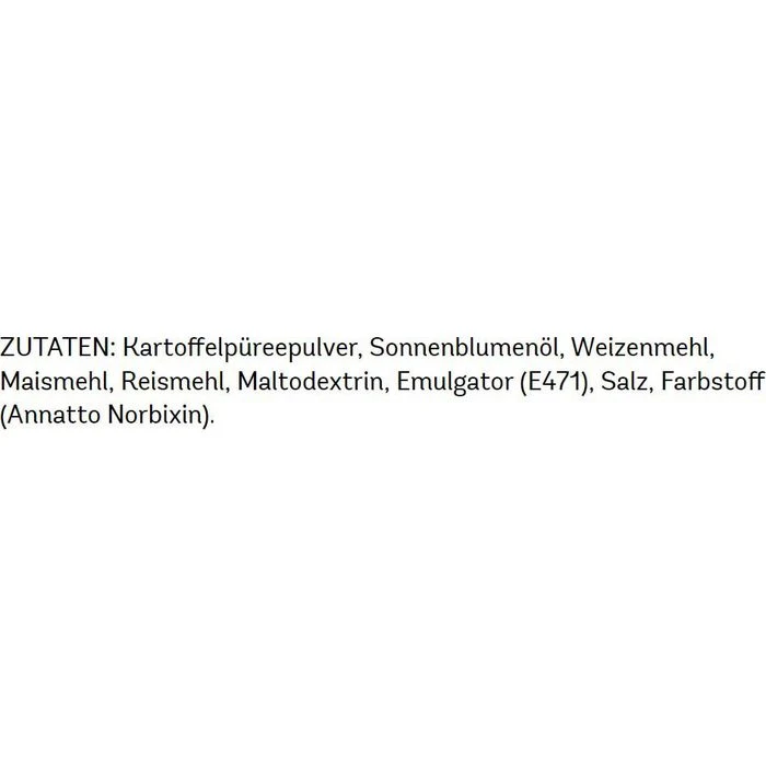 Zutaten: Kartoffelpüreepulver, Sonnenblumenöl, WEIZENMEHL, Maismehl, Reismehl, Maltodextrin, Emulgator (E471), Salz, Farbstoff (Annatto Norbixin).