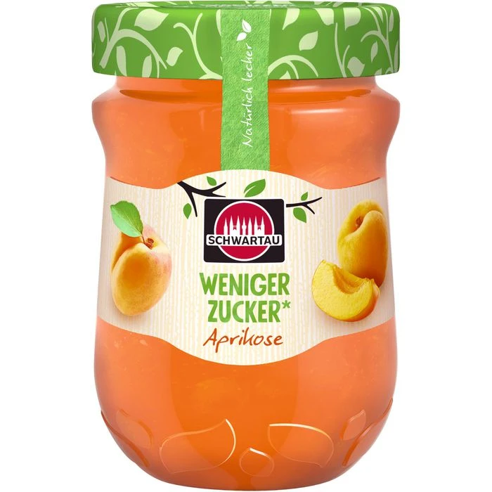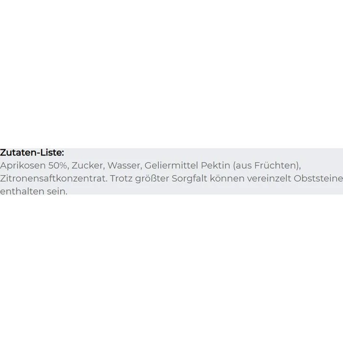 Zutaten: Aprikosen 50%, Zucker, Wasser, Geliermittel Pektin (aus Früchten), Zitronensaftkonzentrat.