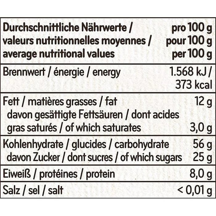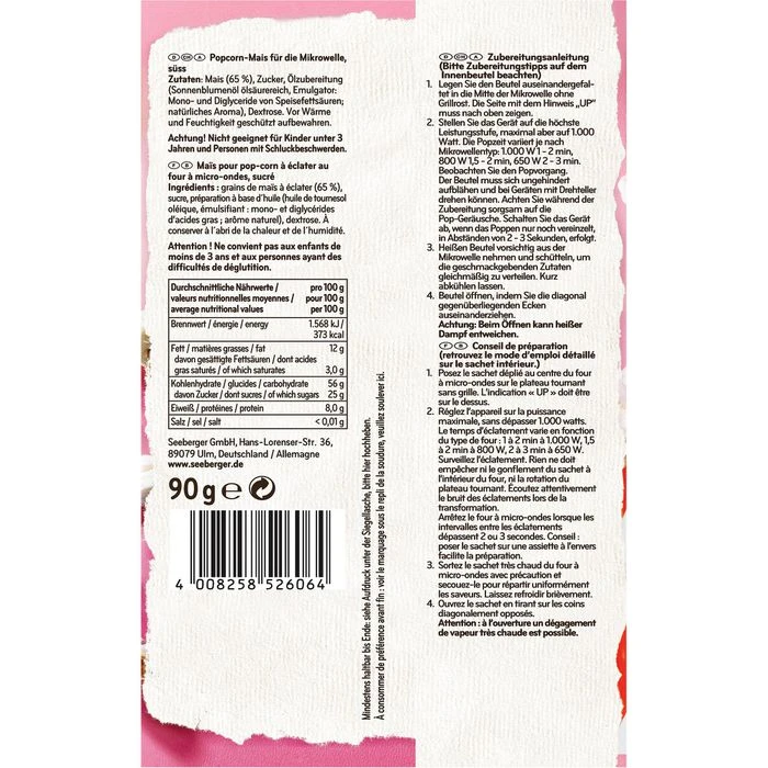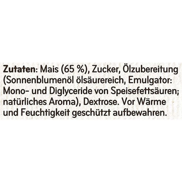 Zutaten: Mais (65%), Zucker, Ölzubereitung (Sonnenblumenöl ölsäurereich, Emlugator: Mono- und Diglyceride von Speisefettsäuren; natürliches Aroma), Dextrose.