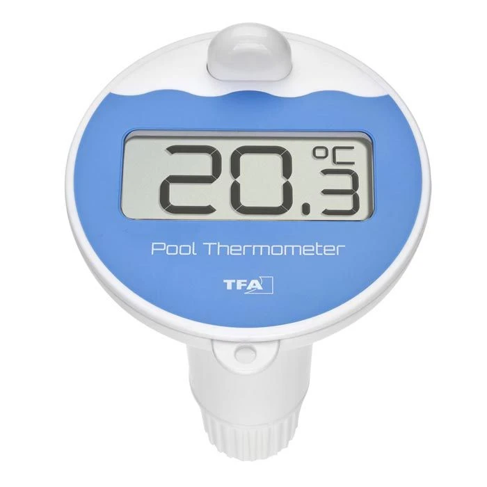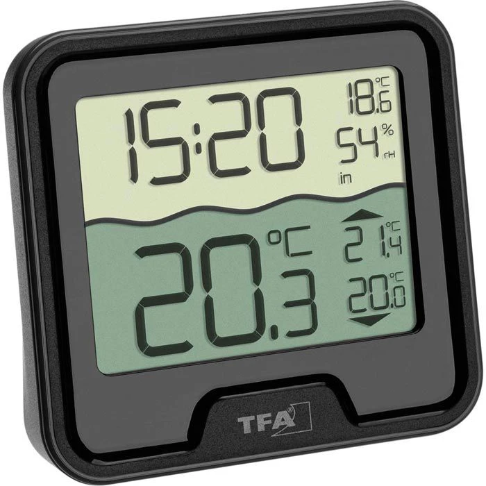 sonstiges: schwimmender Poolsender mit Display, durch türkisfarbene Welle zweigeteiltes Display der Basisstation zur Unterscheidung von Innen- und Poolwerten, integrierte Funkuhr mit Datumsanzeige, zum Stellen und Hängen, optional um 2 Thermo-Hygro-Sender erweiterbar