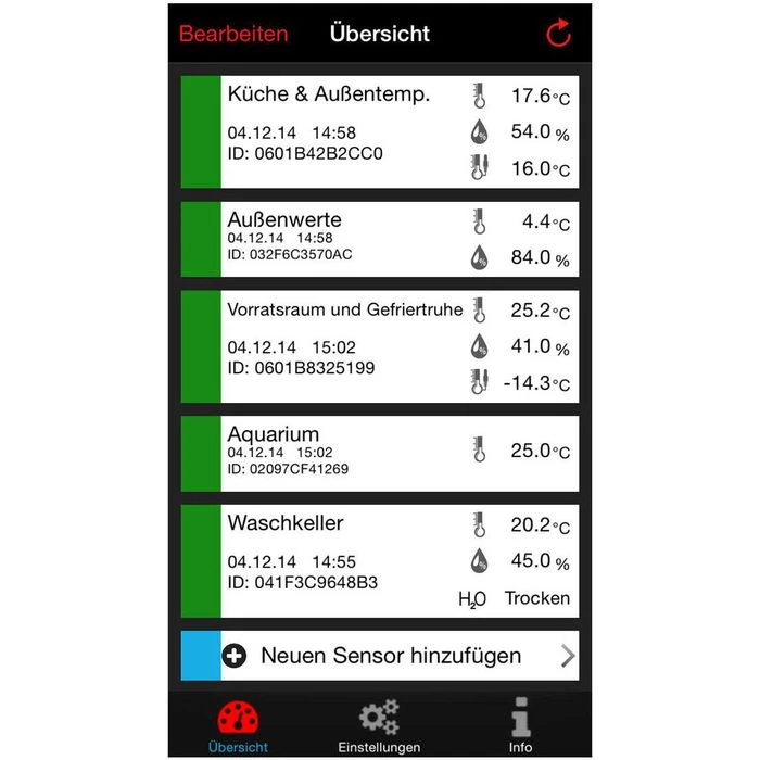 sonstiges: 90 Tage Mindestverfügbarkeit der Daten auf dem Server, Möglichkeiten zum Datenexport, Thermometer mit wasserdichtem Kabelfühler zur professionellen Temperatur-Überwachung von Kühlschränken, Aquarien, Teichen etc.