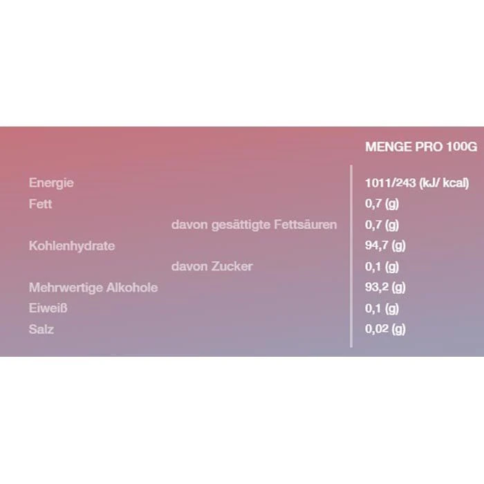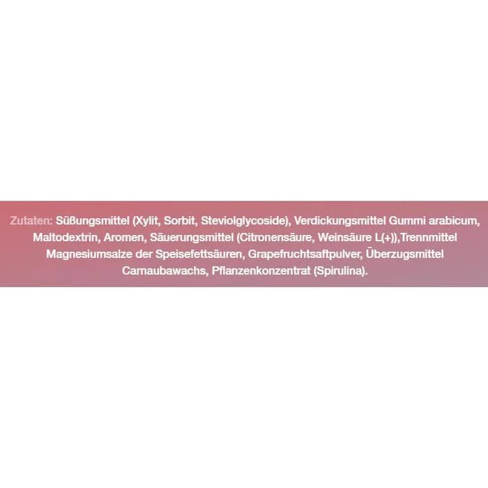 Zutaten: Süßungsmittel (Xylit, Sorbit, Steviolglycoside), Verdickungsmittel Gummiarabicum, Maltodextrin, Aromen, Säuerungsmittel (Citronensäure,Weinsäure L(+)),Trennmittel Magnesiumsalze der Speisefettsäuren,Grapefruchtsaftpulver, Überzugsmittel Carnaubawachs, Pflanzenkonzentrat (Spirulina).